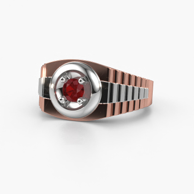 Everyone knows the design of this well-known watch brand. With two colors of rose gold links, this solid 14 Carat rose gold Edward men's ring, is perfectly suited for trendy, successful men. A man who wants to dress to impress with a striking men's ring with 4.7 mm ruby. Show them what you are made of!How do you like this exclusive rose gold men's ring? Simply customize this Edward men's ring, using our online tool. Subsequently, your personal daring Edward men's ring will be made by hand by our goldsmiths. Precious metals and gemstones can be customized to your liking. Do you have specific preferences which are unavailable in our online tool? Please feel free to contact us. We will customize your personal exclusive men's ring to your liking.Our talented designers add new designs to our online collection daily. Together they create a diverse collection of the finest jewelry. If you prefer to make a ring according your own design, please feel free to request a quote. We will make you an amazing offer, based on quality and price.Because we design and deliver our own rings, we can offer you a ring at a price you won't find anywhere else. A ring is made to order, which helps prevent excess supplies, so we can make you a great price offer. We understand it feels risky, buying your ring online, but we will gladly assist in the designing process, taking your budget into consideration.To make it easier for you, we offer a 30 day return policy. Check our terms and conditions.