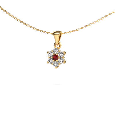 How would you describe your style? Do you like things slightly different? At the very least, this cluster gold pendant Chantal is unique, made especially by jewel designers. Our goldsmith will create your pendant to perfection by hand in our own artisan studio. This classic pendant is set with a ruby. These ruby are selected with great care because we believe your cluster pendant should be adorned with nothing less than the finest gemstones available. Wouldn't you agree?A customized classic cluster pendant is the perfect gift! New exquisite designs are added daily by our team of passionate goldsmiths. And each design can be customized. Simply customize the precious metals and the color of gemstones which will be used, for example. This makes your design of the classic Chantal pendant truly unique!Our team of talented, passionate designers add new pendant designs to our online collection daily. Our objective in doing so, is to be able to offer you a wide variety of jewels. Please feel free to request a quote if you have specific wishes for your pendant. We guarantee to make you an offer you can't refuse.By using a combination of the latest modern techniques, combined with ancient crafting, we can make all our pendants in our own studio. Each jewel is made to order. This is advantageous because we can offer you a price you won't find anywhere else.To make it easier for you, we offer a 30 day return policy. Check our terms and conditions.
