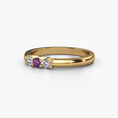 This extraordinary ring is called Yasmin 3. This type of ring is known as a memoire ring, because its gemstones are set in a continuous line. This makes it easy to combine with other rings. The band of this 14 Carat gold ring is set in a combination of amethyst and lab-grown diamond 3 mm. You can easily choose the combination you prefer online. As you can see, a single amethyst is set in this single alliance gold ring. The memoire ring represents collaboration. And that is precisely what these gemstones do, collaborate. Together they add a beautiful effect to the band of a classic ring! Such a meaningful ring, wouldn't you agree? All of our hand selected amethysten are positioned by hand by our expert goldsmith. It's a precise task, which can only be completed successfully through the combination of pure craftsmanship and usage of the latest techniques which give it an optimal effect. To create a perfect reflection of light, all the gemstones have to be perfectly aligned in the same way. During manufacturing, the expert goldsmith will therefore monitor the reflection of light constantly to check whether the amethysten are aligned properly. This requires a skilled hand and a lot of patience but then the end product will be a true piece of art. And that is our mission!By using a combination of the latest modern techniques, combined with ancient crafting, we can make all our rings in our own studio. Each jewel is made to order. This is advantageous because we can offer you a price you won't find anywhere else.Our talented designers add new designs to our online collection daily. Together they create a diverse collection of the finest jewelry. If you prefer to make a ring according your own design, please feel free to request a quote. We will make you an amazing offer, based on quality and price.To make it easier for you, we offer a 30 day return policy. Check our terms and conditions.