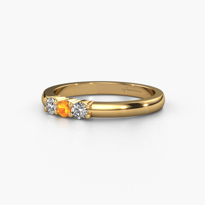 This extraordinary ring is called Yasmin 3. This type of ring is known as a memoire ring, because its gemstones are set in a continuous line. This makes it easy to combine with other rings. The band of this 14 Carat gold ring is set in a combination of citrin and lab-grown diamond 3 mm. You can easily choose the combination you prefer online. As you can see, a single citrin is set in this single alliance gold ring. The memoire ring represents collaboration. And that is precisely what these gemstones do, collaborate. Together they add a beautiful effect to the band of a classic ring! Such a meaningful ring, wouldn't you agree? All of our hand selected citrin are positioned by hand by our expert goldsmith. It's a precise task, which can only be completed successfully through the combination of pure craftsmanship and usage of the latest techniques which give it an optimal effect. To create a perfect reflection of light, all the gemstones have to be perfectly aligned in the same way. During manufacturing, the expert goldsmith will therefore monitor the reflection of light constantly to check whether the citrin are aligned properly. This requires a skilled hand and a lot of patience but then the end product will be a true piece of art. And that is our mission!By using a combination of the latest modern techniques, combined with ancient crafting, we can make all our rings in our own studio. Each jewel is made to order. This is advantageous because we can offer you a price you won't find anywhere else.Our talented designers add new designs to our online collection daily. Together they create a diverse collection of the finest jewelry. If you prefer to make a ring according your own design, please feel free to request a quote. We will make you an amazing offer, based on quality and price.To make it easier for you, we offer a 30 day return policy. Check our terms and conditions.