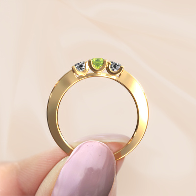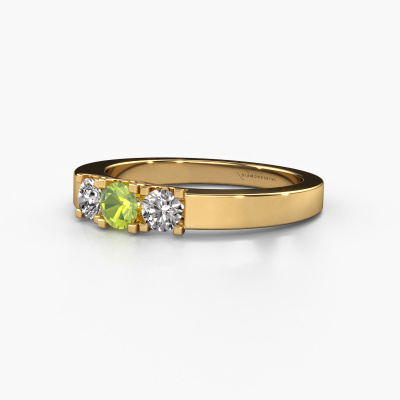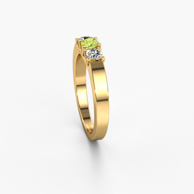This extraordinary ring is called Selina 1. This type of ring is known as a memoire ring, because its gemstones are set in a continuous line. This makes it easy to combine with other rings. The band of this 14 Carat gold ring is set in a combination of peridot and diamond 3.7 mm. You can easily choose the combination you prefer online. As you can see, a single peridot is set in this single alliance gold ring. The memoire ring represents collaboration. And that is precisely what these gemstones do, collaborate. Together they add a beautiful effect to the band of a modern ring! Such a meaningful ring, wouldn't you agree? All of our hand selected peridot are positioned by hand by our expert goldsmith. It's a precise task, which can only be completed successfully through the combination of pure craftsmanship and usage of the latest techniques which give it an optimal effect. To create a perfect reflection of light, all the gemstones have to be perfectly aligned in the same way. During manufacturing, the expert goldsmith will therefore monitor the reflection of light constantly to check whether the peridot are aligned properly. This requires a skilled hand and a lot of patience but then the end product will be a true piece of art. And that is our mission!By using our modern techniques, we can design and customize the finest quality jewels with the utmost care for you. Our rings are always priced 30 percent lower than other jewelers. We make rings to order, so we don't have to maintain a large stock. If you have a certain budget, we are more than happy to advice you accordingly.New jewelry designs are added to our online collection daily. Our team of passionate designers strive to create extraordinary and diverse designs. Have you seen a ring you like? Please feel free to contact us. Based on a good price/ quality ratio, we will make you an offer you can't refuse!To make it easier for you, we offer a 30 day return policy. Check our terms and conditions.