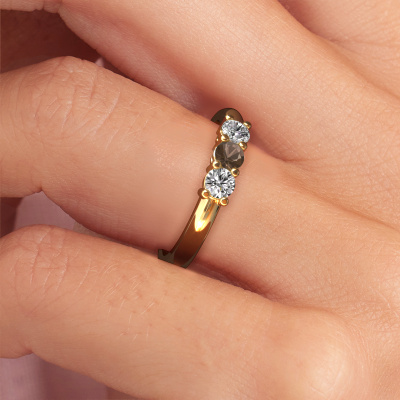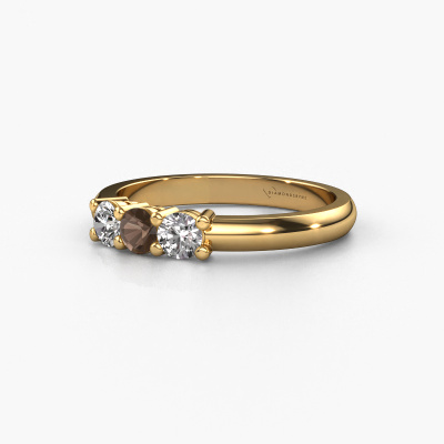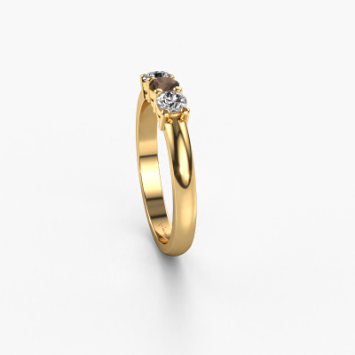 This extraordinary ring is called Michelle 3. This type of ring is known as a memoire ring, because its gemstones are set in a continuous line. This makes it easy to combine with other rings. The band of this 14 Carat gold ring is set in a combination of smokey quartz and lab-grown diamond 3.7 mm. You can easily choose the combination you prefer online. As you can see, a single smokey quartz is set in this single alliance gold ring. The memoire ring represents collaboration. And that is precisely what these gemstones do, collaborate. Together they add a beautiful effect to the band of a classic ring! Such a meaningful ring, wouldn't you agree? All of our hand selected smokey quartz are positioned by hand by our expert goldsmith. It's a precise task, which can only be completed successfully through the combination of pure craftsmanship and usage of the latest techniques which give it an optimal effect. To create a perfect reflection of light, all the gemstones have to be perfectly aligned in the same way. During manufacturing, the expert goldsmith will therefore monitor the reflection of light constantly to check whether the smokey quartz are aligned properly. This requires a skilled hand and a lot of patience but then the end product will be a true piece of art. And that is our mission!Are you on a budget? Please feel free to contact us, so we can go discuss your options. We offer our rings at guaranteed best price, because we make them to order. You won't find such a price anywhere else!