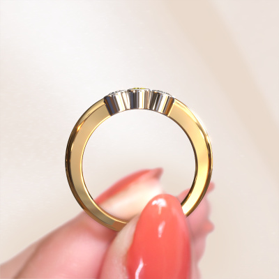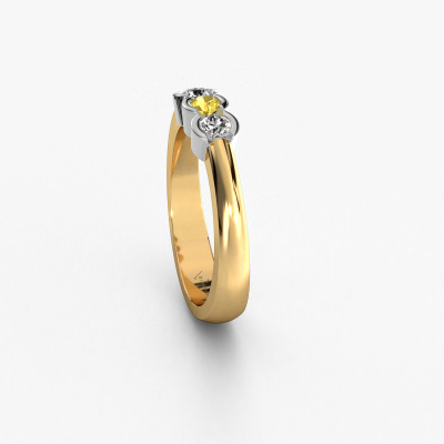 This extraordinary ring is called Lotte 3. This type of ring is known as a memoire ring, because its gemstones are set in a continuous line. This makes it easy to combine with other rings. The band of this 14 Carat gold ring is set in a combination of yellow sapphire and diamond 3 mm. You can easily choose the combination you prefer online. As you can see, a single yellow sapphire is set in this single alliance gold ring. The memoire ring represents collaboration. And that is precisely what these gemstones do, collaborate. Together they add a beautiful effect to the band of a modern ring! Such a meaningful ring, wouldn't you agree? All of our hand selected yellow sapphire are positioned by hand by our expert goldsmith. It's a precise task, which can only be completed successfully through the combination of pure craftsmanship and usage of the latest techniques which give it an optimal effect. To create a perfect reflection of light, all the gemstones have to be perfectly aligned in the same way. During manufacturing, the expert goldsmith will therefore monitor the reflection of light constantly to check whether the yellow sapphire are aligned properly. This requires a skilled hand and a lot of patience but then the end product will be a true piece of art. And that is our mission!By using a combination of the latest modern techniques, combined with ancient crafting, we can make all our rings in our own studio. Each jewel is made to order. This is advantageous because we can offer you a price you won't find anywhere else.Our team of talented, passionate designers add new ring designs to our online collection daily. Our objective in doing so, is to be able to offer you a wide variety of jewels. Please feel free to request a quote if you have specific wishes for your ring. We guarantee to make you an offer you can't refuse.To make it easier for you, we offer a 30 day return policy. Check our terms and conditions.