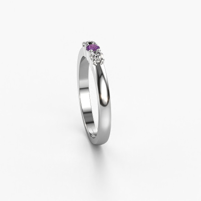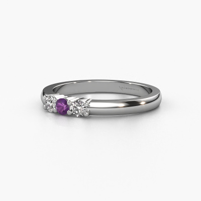 This extraordinary ring is called Yasmin 3. This type of ring is known as a memoire ring, because its gemstones are set in a continuous line. This makes it easy to combine with other rings. The band of this platinum ring is set in a combination of amethyst and lab-grown diamond 3 mm. You can easily choose the combination you prefer online. As you can see, a single amethyst is set in this single alliance platinum ring. The memoire ring represents collaboration. And that is precisely what these gemstones do, collaborate. Together they add a beautiful effect to the band of a classic ring! Such a meaningful ring, wouldn't you agree? All of our hand selected amethysten are positioned by hand by our expert goldsmith. It's a precise task, which can only be completed successfully through the combination of pure craftsmanship and usage of the latest techniques which give it an optimal effect. To create a perfect reflection of light, all the gemstones have to be perfectly aligned in the same way. During manufacturing, the expert goldsmith will therefore monitor the reflection of light constantly to check whether the amethysten are aligned properly. This requires a skilled hand and a lot of patience but then the end product will be a true piece of art. And that is our mission!By using a combination of the latest modern techniques, combined with ancient crafting, we can make all our rings in our own studio. Each jewel is made to order. This is advantageous because we can offer you a price you won't find anywhere else.Our talented designers add new designs to our online collection daily. Together they create a diverse collection of the finest jewelry. If you prefer to make a ring according your own design, please feel free to request a quote. We will make you an amazing offer, based on quality and price.To make it easier for you, we offer a 30 day return policy. Check our terms and conditions.