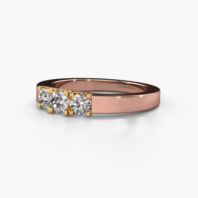 This extraordinary ring is called Selina 1. This type of ring is known as a memoire ring, because its gemstones are set in a continuous line. This makes it easy to combine with other rings. The band of this 14 Carat rose gold ring is set in a combination of zirconia and diamond 3.7 mm. You can easily choose the combination you prefer online. As you can see, a single zirconia is set in this single alliance rose gold ring. The memoire ring represents collaboration. And that is precisely what these gemstones do, collaborate. Together they add a beautiful effect to the band of a modern ring! Such a meaningful ring, wouldn't you agree? All of our hand selected cz-stones are positioned by hand by our expert goldsmith. It's a precise task, which can only be completed successfully through the combination of pure craftsmanship and usage of the latest techniques which give it an optimal effect. To create a perfect reflection of light, all the gemstones have to be perfectly aligned in the same way. During manufacturing, the expert goldsmith will therefore monitor the reflection of light constantly to check whether the cz-stones are aligned properly. This requires a skilled hand and a lot of patience but then the end product will be a true piece of art. And that is our mission!By using our modern techniques, we can design and customize the finest quality jewels with the utmost care for you. Our rings are always priced 30 percent lower than other jewelers. We make rings to order, so we don't have to maintain a large stock. If you have a certain budget, we are more than happy to advice you accordingly.New jewelry designs are added to our online collection daily. Our team of passionate designers strive to create extraordinary and diverse designs. Have you seen a ring you like? Please feel free to contact us. Based on a good price/ quality ratio, we will make you an offer you can't refuse!To make it easier for you, we offer a 30 day return policy. Check our terms and conditions.