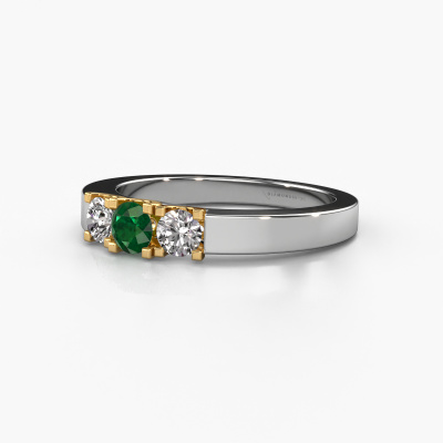 This extraordinary ring is called Selina 1. This type of ring is known as a memoire ring, because its gemstones are set in a continuous line. This makes it easy to combine with other rings. The band of this 14 Carat white gold ring is set in a combination of emerald and diamond 3.7 mm. You can easily choose the combination you prefer online. As you can see, a single emerald is set in this single alliance white gold ring. The memoire ring represents collaboration. And that is precisely what these gemstones do, collaborate. Together they add a beautiful effect to the band of a modern ring! Such a meaningful ring, wouldn't you agree? All of our hand selected emeralds are positioned by hand by our expert goldsmith. It's a precise task, which can only be completed successfully through the combination of pure craftsmanship and usage of the latest techniques which give it an optimal effect. To create a perfect reflection of light, all the gemstones have to be perfectly aligned in the same way. During manufacturing, the expert goldsmith will therefore monitor the reflection of light constantly to check whether the emeralds are aligned properly. This requires a skilled hand and a lot of patience but then the end product will be a true piece of art. And that is our mission!By using our modern techniques, we can design and customize the finest quality jewels with the utmost care for you. Our rings are always priced 30 percent lower than other jewelers. We make rings to order, so we don't have to maintain a large stock. If you have a certain budget, we are more than happy to advice you accordingly.New jewelry designs are added to our online collection daily. Our team of passionate designers strive to create extraordinary and diverse designs. Have you seen a ring you like? Please feel free to contact us. Based on a good price/ quality ratio, we will make you an offer you can't refuse!To make it easier for you, we offer a 30 day return policy. Check our terms and conditions.