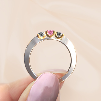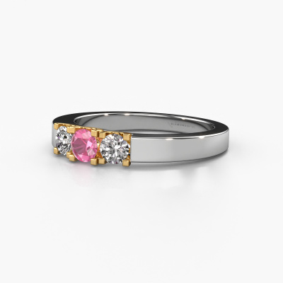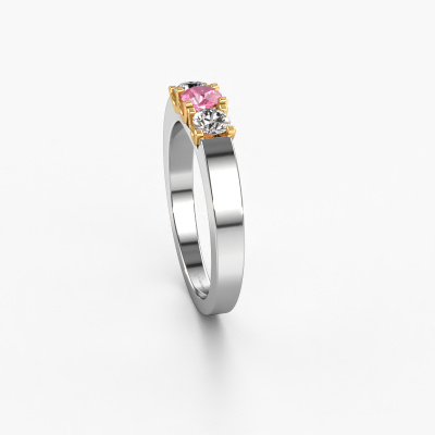 This extraordinary ring is called Selina 1. This type of ring is known as a memoire ring, because its gemstones are set in a continuous line. This makes it easy to combine with other rings. The band of this 14 Carat white gold ring is set in a combination of pink sapphire and diamond 3.7 mm. You can easily choose the combination you prefer online. As you can see, a single pink sapphire is set in this single alliance white gold ring. The memoire ring represents collaboration. And that is precisely what these gemstones do, collaborate. Together they add a beautiful effect to the band of a modern ring! Such a meaningful ring, wouldn't you agree? All of our hand selected pink sapphire are positioned by hand by our expert goldsmith. It's a precise task, which can only be completed successfully through the combination of pure craftsmanship and usage of the latest techniques which give it an optimal effect. To create a perfect reflection of light, all the gemstones have to be perfectly aligned in the same way. During manufacturing, the expert goldsmith will therefore monitor the reflection of light constantly to check whether the pink sapphire are aligned properly. This requires a skilled hand and a lot of patience but then the end product will be a true piece of art. And that is our mission!By using our modern techniques, we can design and customize the finest quality jewels with the utmost care for you. Our rings are always priced 30 percent lower than other jewelers. We make rings to order, so we don't have to maintain a large stock. If you have a certain budget, we are more than happy to advice you accordingly.New jewelry designs are added to our online collection daily. Our team of passionate designers strive to create extraordinary and diverse designs. Have you seen a ring you like? Please feel free to contact us. Based on a good price/ quality ratio, we will make you an offer you can't refuse!To make it easier for you, we offer a 30 day return policy. Check our terms and conditions.