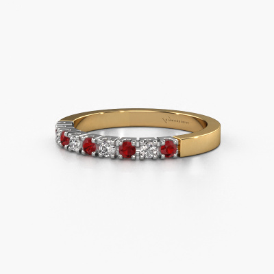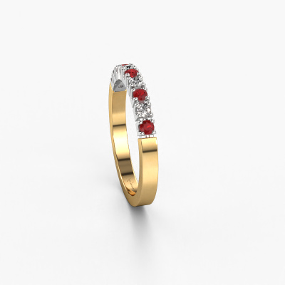 This extraordinary ring is called Dana 9. This type of ring is known as a memoire ring, because its gemstones are set in a continuous line. This makes it easy to combine with other rings. The band of this 14 Carat gold ring is set in a combination of ruby and diamond 2 mm. You can easily choose the combination you prefer online. As you can see, a single ruby is set in this single alliance gold ring. The memoire ring represents collaboration. And that is precisely what these gemstones do, collaborate. Together they add a beautiful effect to the band of a modern ring! Such a meaningful ring, wouldn't you agree? All of our hand selected ruby are positioned by hand by our expert goldsmith. It's a precise task, which can only be completed successfully through the combination of pure craftsmanship and usage of the latest techniques which give it an optimal effect. To create a perfect reflection of light, all the gemstones have to be perfectly aligned in the same way. During manufacturing, the expert goldsmith will therefore monitor the reflection of light constantly to check whether the ruby are aligned properly. This requires a skilled hand and a lot of patience but then the end product will be a true piece of art. And that is our mission!After receiving your order, our goldsmiths will passionately start the creative process of making your ring in our own studio. Because we don't have a big stockpile, these costs will not be passed on to you. Our pricing is proof of that! We offer top quality jewels at lowest price, guaranteed.Our talented designers add new designs to our online collection daily. Together they create a diverse collection of the finest jewelry. If you prefer to make a ring according your own design, please feel free to request a quote. We will make you an amazing offer, based on quality and price.To make it easier for you, we offer a 30 day return policy. Check our terms and conditions.