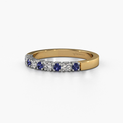 This extraordinary ring is called Dana 9. This type of ring is known as a memoire ring, because its gemstones are set in a continuous line. This makes it easy to combine with other rings. The band of this 14 Carat gold ring is set in a combination of sapphire and diamond 2 mm. You can easily choose the combination you prefer online. As you can see, a single sapphire is set in this single alliance gold ring. The memoire ring represents collaboration. And that is precisely what these gemstones do, collaborate. Together they add a beautiful effect to the band of a modern ring! Such a meaningful ring, wouldn't you agree? All of our hand selected sapphire are positioned by hand by our expert goldsmith. It's a precise task, which can only be completed successfully through the combination of pure craftsmanship and usage of the latest techniques which give it an optimal effect. To create a perfect reflection of light, all the gemstones have to be perfectly aligned in the same way. During manufacturing, the expert goldsmith will therefore monitor the reflection of light constantly to check whether the sapphire are aligned properly. This requires a skilled hand and a lot of patience but then the end product will be a true piece of art. And that is our mission!After receiving your order, our goldsmiths will passionately start the creative process of making your ring in our own studio. Because we don't have a big stockpile, these costs will not be passed on to you. Our pricing is proof of that! We offer top quality jewels at lowest price, guaranteed.Our talented designers add new designs to our online collection daily. Together they create a diverse collection of the finest jewelry. If you prefer to make a ring according your own design, please feel free to request a quote. We will make you an amazing offer, based on quality and price.To make it easier for you, we offer a 30 day return policy. Check our terms and conditions.