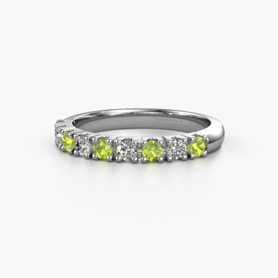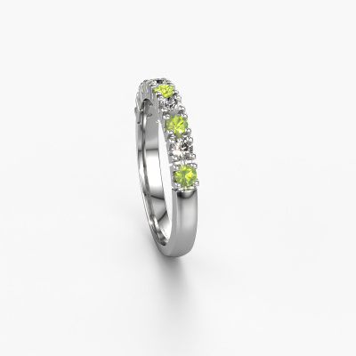 This extraordinary ring is called Rianne 9. This type of ring is known as a memoire ring, because its gemstones are set in a continuous line. This makes it easy to combine with other rings. The band of this platinum ring is set in a combination of peridot and diamond 2.4 mm. You can easily choose the combination you prefer online. As you can see, a single peridot is set in this single alliance platinum ring. The memoire ring represents collaboration. And that is precisely what these gemstones do, collaborate. Together they add a beautiful effect to the band of a classic ring! Such a meaningful ring, wouldn't you agree? All of our hand selected peridot are positioned by hand by our expert goldsmith. It's a precise task, which can only be completed successfully through the combination of pure craftsmanship and usage of the latest techniques which give it an optimal effect. To create a perfect reflection of light, all the gemstones have to be perfectly aligned in the same way. During manufacturing, the expert goldsmith will therefore monitor the reflection of light constantly to check whether the peridot are aligned properly. This requires a skilled hand and a lot of patience but then the end product will be a true piece of art. And that is our mission!Are you on a budget? Please feel free to contact us, so we can go discuss your options. We offer our rings at guaranteed best price, because we make them to order. You won't find such a price anywhere else!