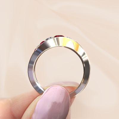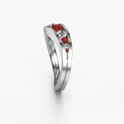 This ring called Sigrid 2 is made of platinum and is set with ruby. Are you in the market for a unique platinum ring with a modern twist? Then this ring might suit you. Simply customize to your or her liking. It suits the contemporary modern woman. This 9 stones ring is set with beautiful ruby. This has been carefully selected. Because your ring must be adorned with nothing but the most stunning gemstone. Our expert goldsmith will create your ring in our own studio, where the ruby will be set with great care. The ring will then be polished to perfection to create a stunning ring. By using a combination of the latest modern techniques, combined with ancient crafting, we can make all our rings in our own studio. Each jewel is made to order. This is advantageous because we can offer you a price you won't find anywhere else.Our team of talented, passionate designers add new ring designs to our online collection daily. Our objective in doing so, is to be able to offer you a wide variety of jewels. Please feel free to request a quote if you have specific wishes for your ring. We guarantee to make you an offer you can't refuse.To make it easier for you, we offer a 30 day return policy. Check our terms and conditions.