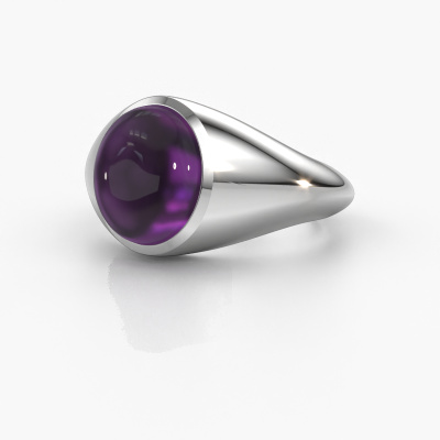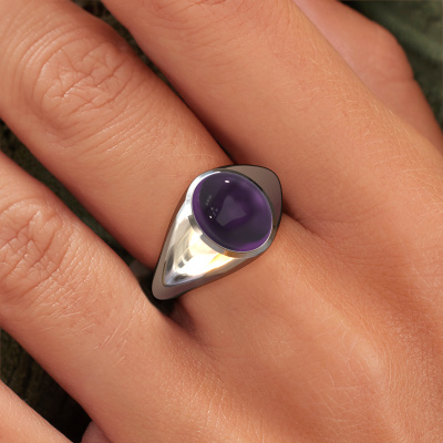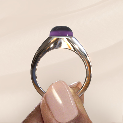 In this photo the platinum Zaza ring is set with a cabochon amethyst. Cabochon means a amethyst is shaped first, not faceted, into a specific shape, such as a drop, heart or oval cabochon. Subsequently, it is polished until the gemstone has a orb shaped surface. A cabochon gemstone is a stunning, classy eye-catcher that matches perfectly with a contemporary as well as a vintage style. Our expert goldsmiths shape the 1 stone ring to perfection which makes it unique. The cabochon amethyst is set so its unique qualities are strengthened. A customized design ring is the perfect gift! New exquisite designs are added daily by our team of passionate goldsmiths. And each design can be customized. Simply customize the precious metals and the color of gemstones which will be used, for example. This makes your design of the design Zaza ring truly unique!After receiving your order, our goldsmiths will start the creative process of making your Zaza ring. We don't keep stock. This is advantageous because these costs will not be passed on to you. Therefore, we can offer jewelry at exceptionally low prices.To make it easier for you, we offer a 30 day return policy. Check our terms and conditions.