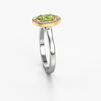 The ring shown above is called Madelon 1. This type of ring is known as a solitaire ring. The 14 Carat white gold ring is set with a 7x5 mm oval peridot center stone surrounded by smaller sized diamonds. This best price white gold halo ring, is set with a big peridot embraced by smaller sized gemstones. The ring got its name for its halo which the smaller sized diamonds help create. In order to achieve a stunning halo, these smaller sized gemstones have to be aligned perfectly so light reflects evenly on the peridot from every angle. And our expert goldsmiths get the job done. Each carefully selected peridot is set by hand with utmost precision. During manufacturing, light fall is constantly monitored to make sure the special halo effect is still visible. In the end you get a unique ring with a radiant peridot gemstone centerpiece. An exquisite ring indeed! The best part of this best price ring is that you can customize it to your own liking. Your style, your choice, your ring. On top of that, your classic white gold ring will be made by hand with eco-friendly materials! Please feel free to easily customize the ring, using our online tool.Are you on a budget? Please feel free to contact us, so we can go discuss your options. We offer our rings at guaranteed best price, because we make them to order. You won't find such a price anywhere else!To make it easier for you, we offer a 30 day return policy. Check our terms and conditions.