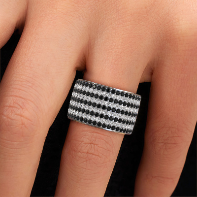 Because of its detailed finish, this wide ring with black diamond has a stylish appearance. A pavé set ring that fits the contemporary woman like a glove. This white gold ring, our Macy, is a true eye-catcher indeed! As soon as we know what you desire, we will create your ring in our own crafting studio. We work according an innovative process. We use a combination of the latest techniques and ancient traditional craftsmanship, so we are able to create a perfectly designed ring. Our expert goldsmiths strive for perfection so they won't stop until a perfect ring, a true work of art, is created especially for you!The best part of this pavé set ring is that you can customize it to your own liking. Your style, your choice, your ring. On top of that, your exclusive white gold ring will be made by hand with eco-friendly materials! Please feel free to easily customize the ring, using our online tool.Are you on a budget? Please feel free to contact us, so we can go discuss your options. We offer our rings at guaranteed best price, because we make them to order. You won't find such a price anywhere else!To make it easier for you, we offer a 30 day return policy. Check our terms and conditions.