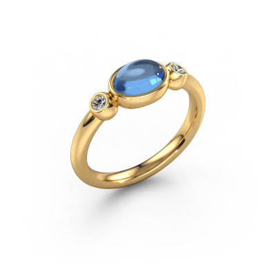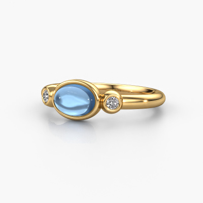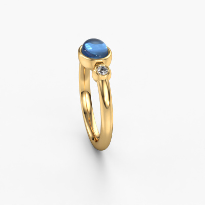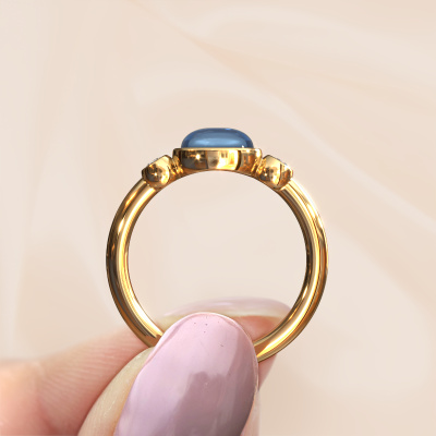 In this photo the gold Liane ring is set with a cabochon blue topaz. Cabochon means a blue topaz is shaped first, not faceted, into a specific shape, such as a drop, heart or oval cabochon. Subsequently, it is polished until the gemstone has a orb shaped surface. A cabochon gemstone is a stunning, classy eye-catcher that matches perfectly with a contemporary as well as a vintage style. Our expert goldsmiths shape the graceful ring to perfection which makes it unique. The cabochon blue topaz is set so its unique qualities are strengthened. Our goldsmiths passionately create your customized ring to your liking with the utmost care. The gold ring, as shown here, can be customized using our online tool. Feel free to ask our jewel designers for assistance if you want changes made which are unavailable in our online tool. We are happy to answer your questions.By using a combination of the latest modern techniques, combined with ancient crafting, we can make all our rings in our own studio. Each jewel is made to order. This is advantageous because we can offer you a price you won't find anywhere else.To make it easier for you, we offer a 30 day return policy. Check our terms and conditions.