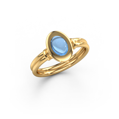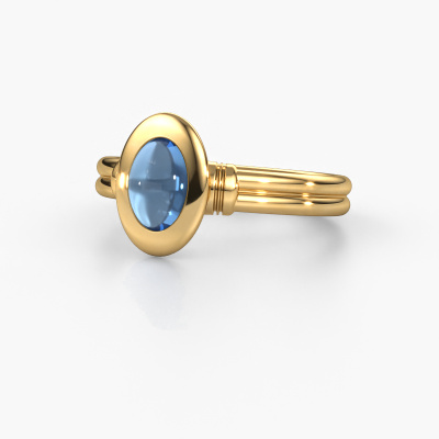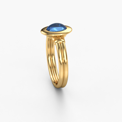 In this photo the gold Brittni ring is set with a cabochon blue topaz. Cabochon means a blue topaz is shaped first, not faceted, into a specific shape, such as a drop, heart or oval cabochon. Subsequently, it is polished until the gemstone has a orb shaped surface. A cabochon gemstone is a stunning, classy eye-catcher that matches perfectly with a contemporary as well as a vintage style. Our expert goldsmiths shape the tasteful ring to perfection which makes it unique. The cabochon blue topaz is set so its unique qualities are strengthened. Our goldsmiths passionately create your customized ring to your liking with the utmost care. The gold ring, as shown here, can be customized using our online tool. Feel free to ask our jewel designers for assistance if you want changes made which are unavailable in our online tool. We are happy to answer your questions.Because we design and deliver our own rings, we can offer you a ring at a price you won't find anywhere else. A ring is made to order, which helps prevent excess supplies, so we can make you a great price offer. We understand it feels risky, buying your ring online, but we will gladly assist in the designing process, taking your budget into consideration.To make it easier for you, we offer a 30 day return policy. Check our terms and conditions.