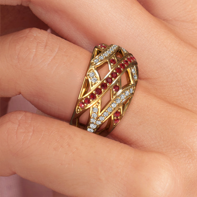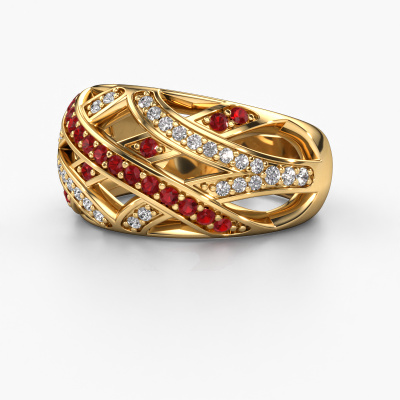 This ring called Yinthe is made of 14 Carat gold and is set with ruby. Are you in the market for a unique gold ring with a modern twist? Then this ring might suit you. Simply customize to your or her liking. It suits the contemporary modern woman. This contemporary ring is set with beautiful ruby. This has been carefully selected. Because your ring must be adorned with nothing but the most stunning gemstone. Our expert goldsmith will create your ring in our own studio, where the ruby will be set with great care. The ring will then be polished to perfection to create a stunning ring. By using our modern techniques, we can design and customize the finest quality jewels with the utmost care for you. Our rings are always priced 30 percent lower than other jewelers. We make rings to order, so we don't have to maintain a large stock. If you have a certain budget, we are more than happy to advice you accordingly.Our talented designers add new designs to our online collection daily. Together they create a diverse collection of the finest jewelry. If you prefer to make a ring according your own design, please feel free to request a quote. We will make you an amazing offer, based on quality and price.To make it easier for you, we offer a 30 day return policy. Check our terms and conditions.