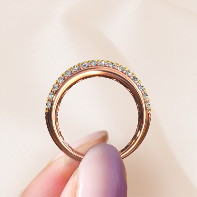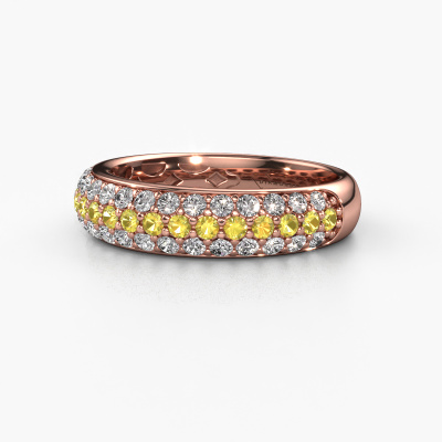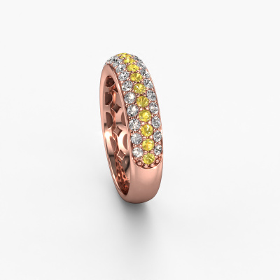 This pave set ring is called Emely 6. This 14 Carat rose gold ring is set with yellow sapphire 1.7 mm. The band of this rose gold ring is set with rows of yellow sapphire which seem to have no beginning nor end. Our goldsmith carefully selects the gemstones and sets them with the utmost precision. For maximum shine, the yellow sapphire have to align perfectly. While artfully crafting and polishing the jewelry, light fall is constantly monitored, until the expert goldsmith is satisfied with the result. Designed by you, created especially for you!Customize your own edgyEmely 6 ring, which will then be created by our goldsmiths with great passion. Do you prefer a different option than is shown here in the rose gold Emely 6 ring? Then our online tools offers various options. Feel free to ask us for help if you are unable to succeed. We are happy to answer your questions!After receiving your order, our goldsmiths will passionately start the creative process of making your ring in our own studio. Because we don't have a big stockpile, these costs will not be passed on to you. Our pricing is proof of that! We offer top quality jewels at lowest price, guaranteed.To make it easier for you, we offer a 30 day return policy. Check our terms and conditions.