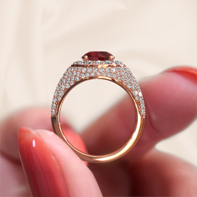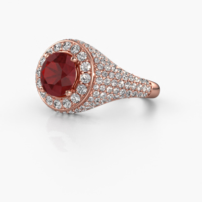 This pave set ring is called Dayle. This 14 Carat rose gold ring is set with ruby 7 mm. The band of this rose gold ring is set with rows of ruby which seem to have no beginning nor end. Our goldsmith carefully selects the gemstones and sets them with the utmost precision. For maximum shine, the ruby have to align perfectly. While artfully crafting and polishing the jewelry, light fall is constantly monitored, until the expert goldsmith is satisfied with the result. Designed by you, created especially for you!The best part of this elegant ring is that you can customize it to your own liking. Your style, your choice, your ring. On top of that, your exclusive rose gold ring will be made by hand with eco-friendly materials! Please feel free to easily customize the ring, using our online tool.Are you on a budget? Please feel free to contact us, so we can go discuss your options. We offer our rings at guaranteed best price, because we make them to order. You won't find such a price anywhere else!To make it easier for you, we offer a 30 day return policy. Check our terms and conditions.