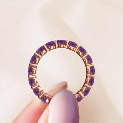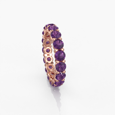 This is our Heddy rnd 3.7 ring. This specific type is called an eternity ring and it is set with a continuous line of identically cut gemstones. The ring is made in 14 Carat rose gold and is set with small amethysten, 3.7 mm. This rose gold Eternity ring is a perfectly beautiful and meaningful way to give your proposal that special touch. The magnificent evenly shaped amethysten are pave set around the ring. The identical amethysten are carefully selected to give the ring a maximum effect. Do keep in mind we use natural resources so small differences between stones are common. The special effect is enhanced due to precise positioning of the amethysten. This requires the utmost precision and a skillful hand but for our skilled artisans this is what excites them. The result is a stackable ring with a row of amethysten which seem to have no beginning nor end. The perfect symbol of your love for her! Isn't she a beauty?By using our modern techniques, we can design and customize the finest quality jewels with the utmost care for you. Our rings are always priced 30 percent lower than other jewelers. We make rings to order, so we don't have to maintain a large stock. If you have a certain budget, we are more than happy to advice you accordingly.New jewelry designs are added to our online collection daily. Our team of passionate designers strive to create extraordinary and diverse designs. Have you seen a ring you like? Please feel free to contact us. Based on a good price/ quality ratio, we will make you an offer you can't refuse!To make it easier for you, we offer a 30 day return policy. Check our terms and conditions.