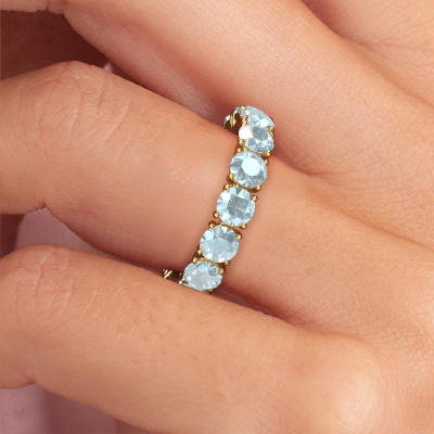 This Vivienne 4.0 stackable ring in 14 Carat gold is set with aquamarine. This gold stacked Vivienne 4.0 ring is the perfect addition to your ring collection! As the name suggests, it is a ring which can be combined on one finger with another ring. It gives you the opportunity to create your own style. A stacked ring usually represents a certain memory of someone special or a memorable moment. It is common to combine a stacked ring, representing an anniversary, with a wedding ring. But this eternity ring, combined with your other rings, also makes a classy fashion item. A customized modern stackable ring is the perfect gift! New exquisite designs are added daily by our team of passionate goldsmiths. And each design can be customized. Simply customize the precious metals and the color of gemstones which will be used, for example. This makes your design of the modern Vivienne 4.0 stackable ring truly unique!Because we design and deliver our own rings, we can offer you a ring at a price you won't find anywhere else. A ring is made to order, which helps prevent excess supplies, so we can make you a great price offer. We understand it feels risky, buying your ring online, but we will gladly assist in the designing process, taking your budget into consideration.To make it easier for you, we offer a 30 day return policy. Check our terms and conditions.