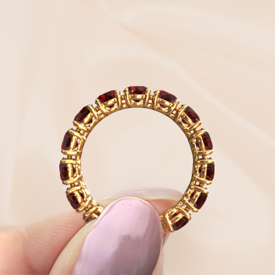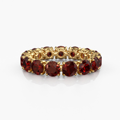 This is our Vivienne 4.2 ring. This specific type is called an eternity ring and it is set with a continuous line of identically cut gemstones. The ring is made in 14 Carat gold and is set with small garnet, 4.2 mm. This gold Eternity ring is a perfectly beautiful and meaningful way to give your proposal that special touch. The magnificent evenly shaped garnet are pave set around the ring. The identical garnet are carefully selected to give the ring a maximum effect. Do keep in mind we use natural resources so small differences between stones are common. The special effect is enhanced due to precise positioning of the garnet. This requires the utmost precision and a skillful hand but for our skilled artisans this is what excites them. The result is a ring with a row of garnet which seem to have no beginning nor end. The perfect symbol of your love for her! Isn't she a beauty?By using a combination of the latest modern techniques, combined with ancient crafting, we can make all our rings in our own studio. Each jewel is made to order. This is advantageous because we can offer you a price you won't find anywhere else.