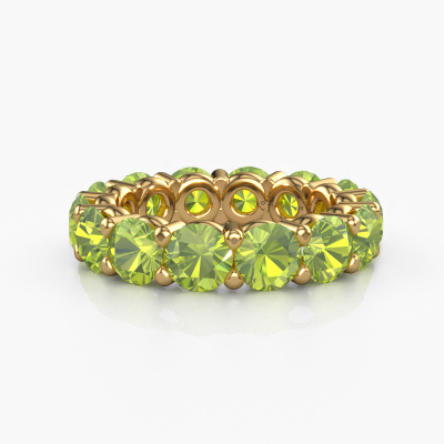 This is our Heddy rnd 5.0 ring. This specific type is called an eternity ring and it is set with a continuous line of identically cut gemstones. The ring is made in 14 Carat gold and is set with small peridot, 5 mm. The amazing peridot are identical in size and are set in the ring band. Our peridot are selected with great care so they are identical, which gives the best result. In order to get the best result, our artisans position all peridot by hand with the utmost care. Our Goldsmiths have one ambition, which is creating the perfect ring. That is why we love what we do. In the end you get a stunning exclusive gold ring with a row of peridot which seem to have no beginning nor end. The perfect symbol of your undying love for her! How special is that!By using a combination of the latest modern techniques, combined with ancient crafting, we can make all our rings in our own studio. Each jewel is made to order. This is advantageous because we can offer you a price you won't find anywhere else.