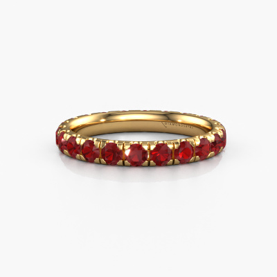 This is our Jackie 2.7 ring. This specific type is called an eternity ring and it is set with a continuous line of identically cut gemstones. The ring is made in 14 Carat gold and is set with small ruby, 2.7 mm. The amazing ruby are identical in size and are set in the ring band. Our ruby are selected with great care so they are identical, which gives the best result. In order to get the best result, our artisans position all ruby by hand with the utmost care. Our Goldsmiths have one ambition, which is creating the perfect ring. That is why we love what we do. In the end you get a stunning modern gold stackable ring with a row of ruby which seem to have no beginning nor end. The perfect symbol of your undying love for her! How special is that!Because we design and deliver our own rings, we can offer you a ring at a price you won't find anywhere else. A ring is made to order, which helps prevent excess supplies, so we can make you a great price offer. We understand it feels risky, buying your ring online, but we will gladly assist in the designing process, taking your budget into consideration.Our team of talented, passionate designers add new ring designs to our online collection daily. Our objective in doing so, is to be able to offer you a wide variety of jewels. Please feel free to request a quote if you have specific wishes for your ring. We guarantee to make you an offer you can't refuse.To make it easier for you, we offer a 30 day return policy. Check our terms and conditions.