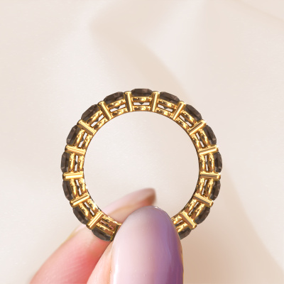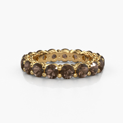 This is our Michelle full 3.7 ring. This specific type is called an eternity ring and it is set with a continuous line of identically cut gemstones. The ring is made in 14 Carat gold and is set with small smokey quartz, 3.7 mm. The amazing smokey quartz are identical in size and are set in the ring band. Our smokey quartz are selected with great care so they are identical, which gives the best result. In order to get the best result, our artisans position all smokey quartz by hand with the utmost care. Our Goldsmiths have one ambition, which is creating the perfect ring. That is why we love what we do. In the end you get a stunning modern gold stackable ring with a row of smokey quartz which seem to have no beginning nor end. The perfect symbol of your undying love for her! How special is that!Because we design and deliver our own rings, we can offer you a ring at a price you won't find anywhere else. A ring is made to order, which helps prevent excess supplies, so we can make you a great price offer. We understand it feels risky, buying your ring online, but we will gladly assist in the designing process, taking your budget into consideration.Our team of talented, passionate designers add new ring designs to our online collection daily. Our objective in doing so, is to be able to offer you a wide variety of jewels. Please feel free to request a quote if you have specific wishes for your ring. We guarantee to make you an offer you can't refuse.To make it easier for you, we offer a 30 day return policy. Check our terms and conditions.