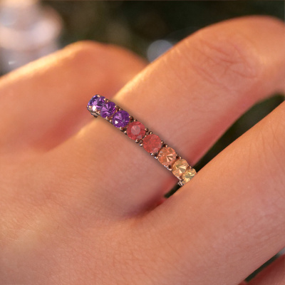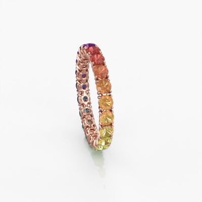 This is our Vivienne 2.9 ring. This specific type is called an eternity ring and it is set with a continuous line of identically cut gemstones. The ring is made in 14 Carat rose gold and is set with small Rainbow sapphire 1, 2.9 mm. This rose gold Eternity ring is a perfectly beautiful and meaningful way to give your proposal that special touch. The magnificent evenly shaped Rainbow sapphire 1 are pave set around the ring. The identical Rainbow sapphire 1 are carefully selected to give the ring a maximum effect. Do keep in mind we use natural resources so small differences between stones are common. The special effect is enhanced due to precise positioning of the Rainbow sapphire 1. This requires the utmost precision and a skillful hand but for our skilled artisans this is what excites them. The result is a ring with a row of Rainbow sapphire 1 which seem to have no beginning nor end. The perfect symbol of your love for her! Isn't she a beauty?By using our modern techniques, we can design and customize the finest quality jewels with the utmost care for you. Our rings are always priced 30 percent lower than other jewelers. We make rings to order, so we don't have to maintain a large stock. If you have a certain budget, we are more than happy to advice you accordingly.New jewelry designs are added to our online collection daily. Our team of passionate designers strive to create extraordinary and diverse designs. Have you seen a ring you like? Please feel free to contact us. Based on a good price/ quality ratio, we will make you an offer you can't refuse!To make it easier for you, we offer a 30 day return policy. Check our terms and conditions.