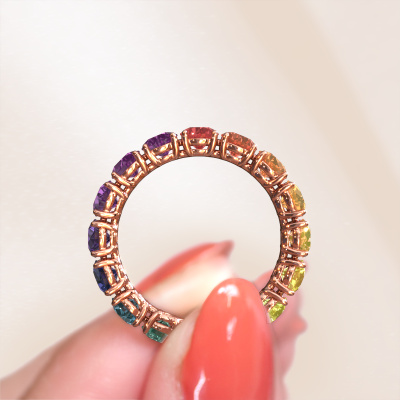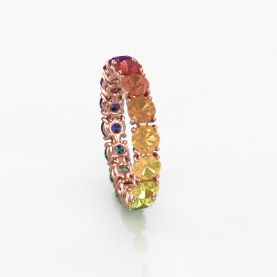 This Vivienne 4.0 stackable ring in 14 Carat rose gold is set with Rainbow sapphire 1. This rose gold stacked Vivienne 4.0 ring is the perfect addition to your ring collection! As the name suggests, it is a ring which can be combined on one finger with another ring. It gives you the opportunity to create your own style. A stacked ring usually represents a certain memory of someone special or a memorable moment. It is common to combine a stacked ring, representing an anniversary, with a wedding ring. But this eternity ring, combined with your other rings, also makes a classy fashion item. A customized modern stackable ring is the perfect gift! New exquisite designs are added daily by our team of passionate goldsmiths. And each design can be customized. Simply customize the precious metals and the color of gemstones which will be used, for example. This makes your design of the modern Vivienne 4.0 stackable ring truly unique!Because we design and deliver our own rings, we can offer you a ring at a price you won't find anywhere else. A ring is made to order, which helps prevent excess supplies, so we can make you a great price offer. We understand it feels risky, buying your ring online, but we will gladly assist in the designing process, taking your budget into consideration.To make it easier for you, we offer a 30 day return policy. Check our terms and conditions.