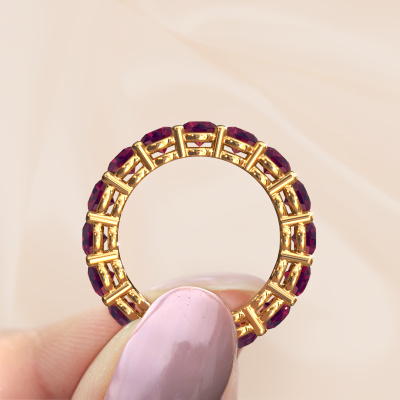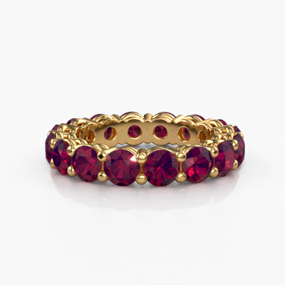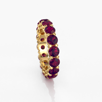 This is our Michelle full 4.2 ring. This specific type is called an eternity ring and it is set with a continuous line of identically cut gemstones. The ring is made in 14 Carat gold and is set with small rhodolite, 4.2 mm. This gold Eternity ring is a perfectly beautiful and meaningful way to give your proposal that special touch. The magnificent evenly shaped rhodolite are pave set around the ring. The identical rhodolite are carefully selected to give the ring a maximum effect. Do keep in mind we use natural resources so small differences between stones are common. The special effect is enhanced due to precise positioning of the rhodolite. This requires the utmost precision and a skillful hand but for our skilled artisans this is what excites them. The result is a stackable ring with a row of rhodolite which seem to have no beginning nor end. The perfect symbol of your love for her! Isn't she a beauty?After receiving your order, our goldsmiths will start the creative process of making your Michelle full 4.2 ring. We don't keep stock. This is advantageous because these costs will not be passed on to you. Therefore, we can offer jewelry at exceptionally low prices.New jewelry designs are added to our online collection daily. Our team of passionate designers strive to create extraordinary and diverse designs. Have you seen a ring you like? Please feel free to contact us. Based on a good price/ quality ratio, we will make you an offer you can't refuse!To make it easier for you, we offer a 30 day return policy. Check our terms and conditions.