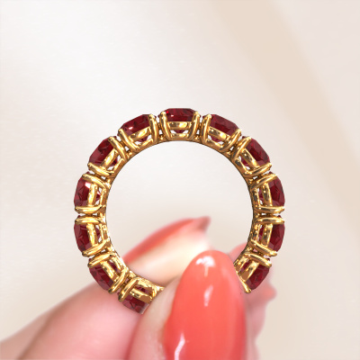 This is our Vivienne 5.0 ring. This specific type is called an eternity ring and it is set with a continuous line of identically cut gemstones. The ring is made in 14 Carat gold and is set with small ruby, 5 mm. The amazing ruby are identical in size and are set in the ring band. Our ruby are selected with great care so they are identical, which gives the best result. In order to get the best result, our artisans position all ruby by hand with the utmost care. Our Goldsmiths have one ambition, which is creating the perfect ring. That is why we love what we do. In the end you get a stunning exclusive gold ring with a row of ruby which seem to have no beginning nor end. The perfect symbol of your undying love for her! How special is that!By using our modern techniques, we can design and customize the finest quality jewels with the utmost care for you. Our rings are always priced 30 percent lower than other jewelers. We make rings to order, so we don't have to maintain a large stock. If you have a certain budget, we are more than happy to advice you accordingly.New jewelry designs are added to our online collection daily. Our team of passionate designers strive to create extraordinary and diverse designs. Have you seen a ring you like? Please feel free to contact us. Based on a good price/ quality ratio, we will make you an offer you can't refuse!To make it easier for you, we offer a 30 day return policy. Check our terms and conditions.