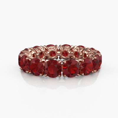 This is our Vivienne 5.0 ring. This specific type is called an eternity ring and it is set with a continuous line of identically cut gemstones. The ring is made in 14 Carat rose gold and is set with small ruby, 5 mm. The amazing ruby are identical in size and are set in the ring band. Our ruby are selected with great care so they are identical, which gives the best result. In order to get the best result, our artisans position all ruby by hand with the utmost care. Our Goldsmiths have one ambition, which is creating the perfect ring. That is why we love what we do. In the end you get a stunning exclusive rose gold ring with a row of ruby which seem to have no beginning nor end. The perfect symbol of your undying love for her! How special is that!By using our modern techniques, we can design and customize the finest quality jewels with the utmost care for you. Our rings are always priced 30 percent lower than other jewelers. We make rings to order, so we don't have to maintain a large stock. If you have a certain budget, we are more than happy to advice you accordingly.New jewelry designs are added to our online collection daily. Our team of passionate designers strive to create extraordinary and diverse designs. Have you seen a ring you like? Please feel free to contact us. Based on a good price/ quality ratio, we will make you an offer you can't refuse!To make it easier for you, we offer a 30 day return policy. Check our terms and conditions.