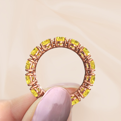 This is our Vivienne 4.7 ring. This specific type is called an eternity ring and it is set with a continuous line of identically cut gemstones. The ring is made in 14 Carat rose gold and is set with small yellow sapphire, 4.7 mm. The amazing yellow sapphire are identical in size and are set in the ring band. Our yellow sapphire are selected with great care so they are identical, which gives the best result. In order to get the best result, our artisans position all yellow sapphire by hand with the utmost care. Our Goldsmiths have one ambition, which is creating the perfect ring. That is why we love what we do. In the end you get a stunning exclusive rose gold ring with a row of yellow sapphire which seem to have no beginning nor end. The perfect symbol of your undying love for her! How special is that!After receiving your order, our goldsmiths will passionately start the creative process of making your ring in our own studio. Because we don't have a big stockpile, these costs will not be passed on to you. Our pricing is proof of that! We offer top quality jewels at lowest price, guaranteed.Our talented designers add new designs to our online collection daily. Together they create a diverse collection of the finest jewelry. If you prefer to make a ring according your own design, please feel free to request a quote. We will make you an amazing offer, based on quality and price.To make it easier for you, we offer a 30 day return policy. Check our terms and conditions.