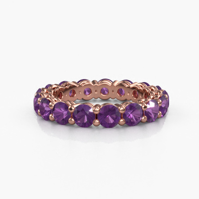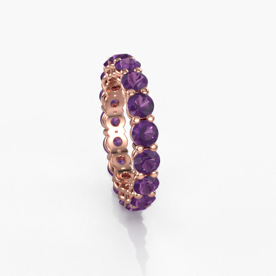 This is our Michelle full 3.7 ring. This specific type is called an eternity ring and it is set with a continuous line of identically cut gemstones. The ring is made in 14 Carat rose gold and is set with small amethysten, 3.7 mm. The amazing amethysten are identical in size and are set in the ring band. Our amethysten are selected with great care so they are identical, which gives the best result. In order to get the best result, our artisans position all amethysten by hand with the utmost care. Our Goldsmiths have one ambition, which is creating the perfect ring. That is why we love what we do. In the end you get a stunning modern rose gold stackable ring with a row of amethysten which seem to have no beginning nor end. The perfect symbol of your undying love for her! How special is that!Because we design and deliver our own rings, we can offer you a ring at a price you won't find anywhere else. A ring is made to order, which helps prevent excess supplies, so we can make you a great price offer. We understand it feels risky, buying your ring online, but we will gladly assist in the designing process, taking your budget into consideration.Our team of talented, passionate designers add new ring designs to our online collection daily. Our objective in doing so, is to be able to offer you a wide variety of jewels. Please feel free to request a quote if you have specific wishes for your ring. We guarantee to make you an offer you can't refuse.To make it easier for you, we offer a 30 day return policy. Check our terms and conditions.