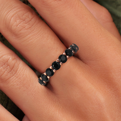 This is our Michelle full 3.7 ring. This specific type is called an eternity ring and it is set with a continuous line of identically cut gemstones. The ring is made in 14 Carat rose gold and is set with small black diamonds, 4.32 crt. The amazing black diamonds are identical in size and are set in the ring band. Our black diamonds are selected with great care so they are identical, which gives the best result. In order to get the best result, our artisans position all black diamonds by hand with the utmost care. Our Goldsmiths have one ambition, which is creating the perfect ring. That is why we love what we do. In the end you get a stunning modern rose gold stackable ring with a row of black diamonds which seem to have no beginning nor end. The perfect symbol of your undying love for her! How special is that!Because we design and deliver our own rings, we can offer you a ring at a price you won't find anywhere else. A ring is made to order, which helps prevent excess supplies, so we can make you a great price offer. We understand it feels risky, buying your ring online, but we will gladly assist in the designing process, taking your budget into consideration.Our team of talented, passionate designers add new ring designs to our online collection daily. Our objective in doing so, is to be able to offer you a wide variety of jewels. Please feel free to request a quote if you have specific wishes for your ring. We guarantee to make you an offer you can't refuse.To make it easier for you, we offer a 30 day return policy. Check our terms and conditions.