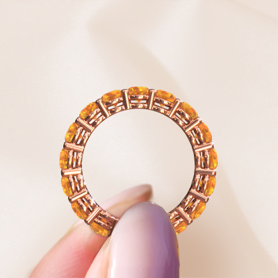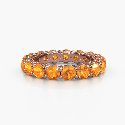 This is our Michelle full 3.7 ring. This specific type is called an eternity ring and it is set with a continuous line of identically cut gemstones. The ring is made in 14 Carat rose gold and is set with small citrin, 3.7 mm. The amazing citrin are identical in size and are set in the ring band. Our citrin are selected with great care so they are identical, which gives the best result. In order to get the best result, our artisans position all citrin by hand with the utmost care. Our Goldsmiths have one ambition, which is creating the perfect ring. That is why we love what we do. In the end you get a stunning modern rose gold stackable ring with a row of citrin which seem to have no beginning nor end. The perfect symbol of your undying love for her! How special is that!Because we design and deliver our own rings, we can offer you a ring at a price you won't find anywhere else. A ring is made to order, which helps prevent excess supplies, so we can make you a great price offer. We understand it feels risky, buying your ring online, but we will gladly assist in the designing process, taking your budget into consideration.Our team of talented, passionate designers add new ring designs to our online collection daily. Our objective in doing so, is to be able to offer you a wide variety of jewels. Please feel free to request a quote if you have specific wishes for your ring. We guarantee to make you an offer you can't refuse.To make it easier for you, we offer a 30 day return policy. Check our terms and conditions.