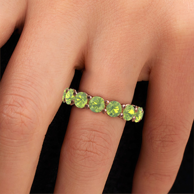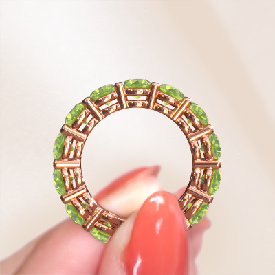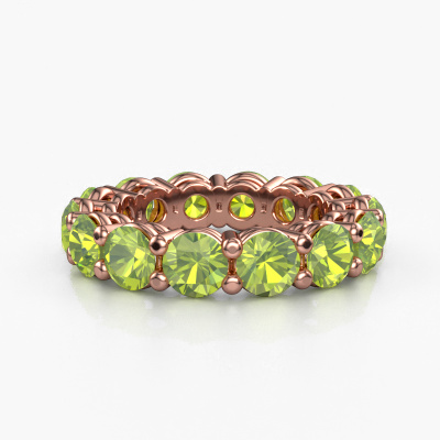 This is our Michelle full 4.7 ring. This specific type is called an eternity ring and it is set with a continuous line of identically cut gemstones. The ring is made in 14 Carat rose gold and is set with small peridot, 4.7 mm. The amazing peridot are identical in size and are set in the ring band. Our peridot are selected with great care so they are identical, which gives the best result. In order to get the best result, our artisans position all peridot by hand with the utmost care. Our Goldsmiths have one ambition, which is creating the perfect ring. That is why we love what we do. In the end you get a stunning exclusive rose gold stackable ring with a row of peridot which seem to have no beginning nor end. The perfect symbol of your undying love for her! How special is that!Because we design and deliver our own rings, we can offer you a ring at a price you won't find anywhere else. A ring is made to order, which helps prevent excess supplies, so we can make you a great price offer. We understand it feels risky, buying your ring online, but we will gladly assist in the designing process, taking your budget into consideration.Our team of talented, passionate designers add new ring designs to our online collection daily. Our objective in doing so, is to be able to offer you a wide variety of jewels. Please feel free to request a quote if you have specific wishes for your ring. We guarantee to make you an offer you can't refuse.To make it easier for you, we offer a 30 day return policy. Check our terms and conditions.