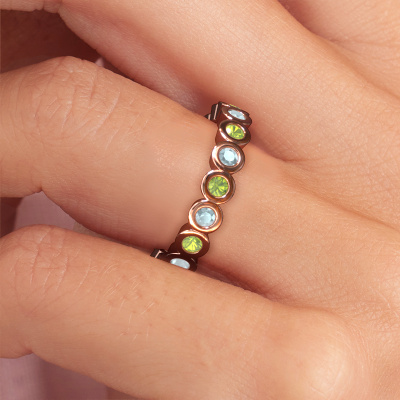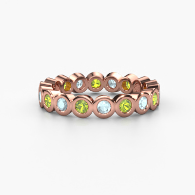 This is our Edwina 2 ring. This specific type is called an eternity ring and it is set with a continuous line of identically cut gemstones. The ring is made in 14 Carat rose gold and is set with small peridot, 2.5 mm. The amazing peridot are identical in size and are set in the ring band. Our peridot are selected with great care so they are identical, which gives the best result. In order to get the best result, our artisans position all peridot by hand with the utmost care. Our Goldsmiths have one ambition, which is creating the perfect ring. That is why we love what we do. In the end you get a stunning trendy rose gold stackable ring with a row of peridot which seem to have no beginning nor end. The perfect symbol of your undying love for her! How special is that!By using our modern techniques, we can design and customize the finest quality jewels with the utmost care for you. Our rings are always priced 30 percent lower than other jewelers. We make rings to order, so we don't have to maintain a large stock. If you have a certain budget, we are more than happy to advice you accordingly.Our talented designers add new designs to our online collection daily. Together they create a diverse collection of the finest jewelry. If you prefer to make a ring according your own design, please feel free to request a quote. We will make you an amazing offer, based on quality and price.To make it easier for you, we offer a 30 day return policy. Check our terms and conditions.