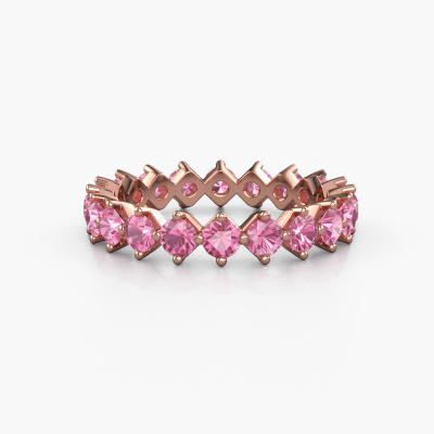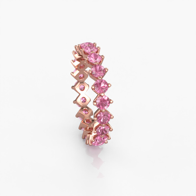 This is our Janie 3.0mm ring. This specific type is called an eternity ring and it is set with a continuous line of identically cut gemstones. The ring is made in 14 Carat rose gold and is set with small pink sapphire, 3 mm. The amazing pink sapphire are identical in size and are set in the ring band. Our pink sapphire are selected with great care so they are identical, which gives the best result. In order to get the best result, our artisans position all pink sapphire by hand with the utmost care. Our Goldsmiths have one ambition, which is creating the perfect ring. That is why we love what we do. In the end you get a stunning fantasy rose gold stackable ring with a row of pink sapphire which seem to have no beginning nor end. The perfect symbol of your undying love for her! How special is that!By using a combination of the latest modern techniques, combined with ancient crafting, we can make all our rings in our own studio. Each jewel is made to order. This is advantageous because we can offer you a price you won't find anywhere else.