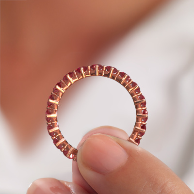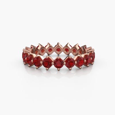 This is our Janie 3.0mm ring. This specific type is called an eternity ring and it is set with a continuous line of identically cut gemstones. The ring is made in 14 Carat rose gold and is set with small ruby, 3 mm. The amazing ruby are identical in size and are set in the ring band. Our ruby are selected with great care so they are identical, which gives the best result. In order to get the best result, our artisans position all ruby by hand with the utmost care. Our Goldsmiths have one ambition, which is creating the perfect ring. That is why we love what we do. In the end you get a stunning fantasy rose gold stackable ring with a row of ruby which seem to have no beginning nor end. The perfect symbol of your undying love for her! How special is that!By using a combination of the latest modern techniques, combined with ancient crafting, we can make all our rings in our own studio. Each jewel is made to order. This is advantageous because we can offer you a price you won't find anywhere else.