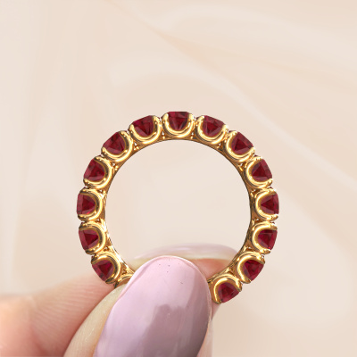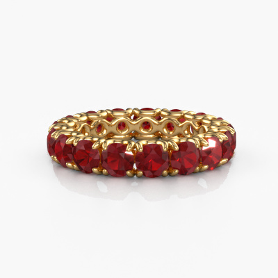 This Estee 4.0 ring in 14 Carat gold is set with ruby. This gold stacked Estee 4.0 ring is the perfect addition to your ring collection! As the name suggests, it is a ring which can be combined on one finger with another ring. It gives you the opportunity to create your own style. A stacked ring usually represents a certain memory of someone special or a memorable moment. It is common to combine a stacked ring, representing an anniversary, with a wedding ring. But this eternity ring, combined with your other rings, also makes a classy fashion item. As soon as you finished designing your Estee 4.0 ring with our online tool, our goldsmiths will start their creative process of making your ring. This will be done with passion and care, according ancient crafting. On top of that, our jewels are made of eco-friendly materials. Simply customize online with our online tool, if you want any changes made. If you want specific changes made to your Estee 4.0 ring, that are unavailable in our online tool, please feel free to contact our expert designers.By using our modern techniques, we can design and customize the finest quality jewels with the utmost care for you. Our rings are always priced 30 percent lower than other jewelers. We make rings to order, so we don't have to maintain a large stock. If you have a certain budget, we are more than happy to advice you accordingly.To make it easier for you, we offer a 30 day return policy. Check our terms and conditions.