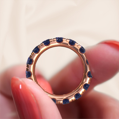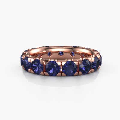 This is our Jackie 4.2 ring. This specific type is called an eternity ring and it is set with a continuous line of identically cut gemstones. The ring is made in 14 Carat rose gold and is set with small sapphire, 4.2 mm. This rose gold Eternity ring is a perfectly beautiful and meaningful way to give your proposal that special touch. The magnificent evenly shaped sapphire are pave set around the ring. The identical sapphire are carefully selected to give the ring a maximum effect. Do keep in mind we use natural resources so small differences between stones are common. The special effect is enhanced due to precise positioning of the sapphire. This requires the utmost precision and a skillful hand but for our skilled artisans this is what excites them. The result is a stackable ring with a row of sapphire which seem to have no beginning nor end. The perfect symbol of your love for her! Isn't she a beauty?After receiving your order, our goldsmiths will start the creative process of making your Jackie 4.2 ring. We don't keep stock. This is advantageous because these costs will not be passed on to you. Therefore, we can offer jewelry at exceptionally low prices.New jewelry designs are added to our online collection daily. Our team of passionate designers strive to create extraordinary and diverse designs. Have you seen a ring you like? Please feel free to contact us. Based on a good price/ quality ratio, we will make you an offer you can't refuse!To make it easier for you, we offer a 30 day return policy. Check our terms and conditions.