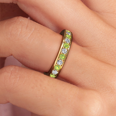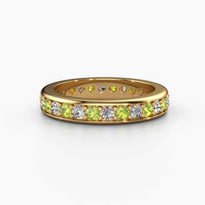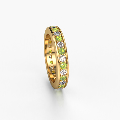 This is our Nienke ring. This specific type is called an eternity ring and it is set with a continuous line of identically cut gemstones. The ring is made in 14 Carat gold and is set with small peridot, 2.2 mm. The amazing peridot are identical in size and are set in the ring band. Our peridot are selected with great care so they are identical, which gives the best result. In order to get the best result, our artisans position all peridot by hand with the utmost care. Our Goldsmiths have one ambition, which is creating the perfect ring. That is why we love what we do. In the end you get a stunning modern gold stackable ring with a row of peridot which seem to have no beginning nor end. The perfect symbol of your undying love for her! How special is that!After receiving your order, our goldsmiths will start the creative process of making your Nienke ring. We don't keep stock. This is advantageous because these costs will not be passed on to you. Therefore, we can offer jewelry at exceptionally low prices.Our team of talented, passionate designers add new ring designs to our online collection daily. Our objective in doing so, is to be able to offer you a wide variety of jewels. Please feel free to request a quote if you have specific wishes for your ring. We guarantee to make you an offer you can't refuse.To make it easier for you, we offer a 30 day return policy. Check our terms and conditions.