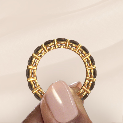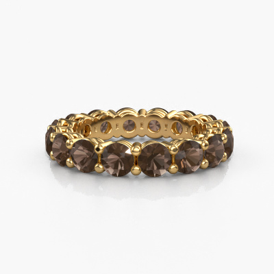 This is our Michelle full 4.0 ring. This specific type is called an eternity ring and it is set with a continuous line of identically cut gemstones. The ring is made in 14 Carat gold and is set with small smokey quartz, 4 mm. The amazing smokey quartz are identical in size and are set in the ring band. Our smokey quartz are selected with great care so they are identical, which gives the best result. In order to get the best result, our artisans position all smokey quartz by hand with the utmost care. Our Goldsmiths have one ambition, which is creating the perfect ring. That is why we love what we do. In the end you get a stunning modern gold stackable ring with a row of smokey quartz which seem to have no beginning nor end. The perfect symbol of your undying love for her! How special is that!By using a combination of the latest modern techniques, combined with ancient crafting, we can make all our rings in our own studio. Each jewel is made to order. This is advantageous because we can offer you a price you won't find anywhere else.Our talented designers add new designs to our online collection daily. Together they create a diverse collection of the finest jewelry. If you prefer to make a ring according your own design, please feel free to request a quote. We will make you an amazing offer, based on quality and price.To make it easier for you, we offer a 30 day return policy. Check our terms and conditions.