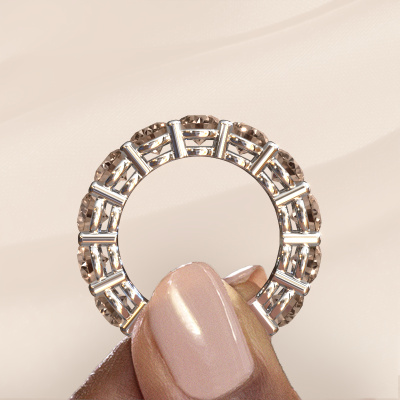 This is our Michelle full 5.0 ring. This specific type is called an eternity ring and it is set with a continuous line of identically cut gemstones. The ring is made in platinum and is set with small brown diamonds, 7.50 crt. The amazing brown diamonds are identical in size and are set in the ring band. Our brown diamonds are selected with great care so they are identical, which gives the best result. In order to get the best result, our artisans position all brown diamonds by hand with the utmost care. Our Goldsmiths have one ambition, which is creating the perfect ring. That is why we love what we do. In the end you get a stunning exclusive platinum stackable ring with a row of brown diamonds which seem to have no beginning nor end. The perfect symbol of your undying love for her! How special is that!By using a combination of the latest modern techniques, combined with ancient crafting, we can make all our rings in our own studio. Each jewel is made to order. This is advantageous because we can offer you a price you won't find anywhere else.New jewelry designs are added to our online collection daily. Our team of passionate designers strive to create extraordinary and diverse designs. Have you seen a ring you like? Please feel free to contact us. Based on a good price/ quality ratio, we will make you an offer you can't refuse!To make it easier for you, we offer a 30 day return policy. Check our terms and conditions.
