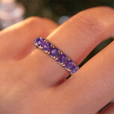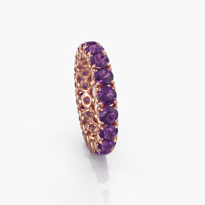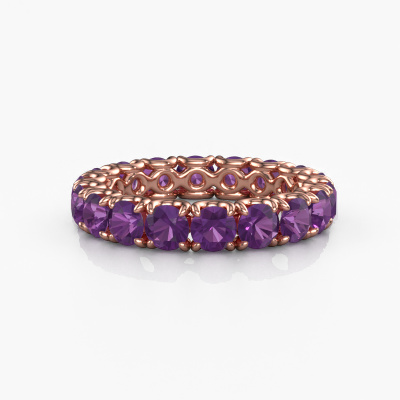 This is our Estee 3.7 ring. This specific type is called an eternity ring and it is set with a continuous line of identically cut gemstones. The ring is made in 14 Carat rose gold and is set with small amethysten, 3.7 mm. The amazing amethysten are identical in size and are set in the ring band. Our amethysten are selected with great care so they are identical, which gives the best result. In order to get the best result, our artisans position all amethysten by hand with the utmost care. Our Goldsmiths have one ambition, which is creating the perfect ring. That is why we love what we do. In the end you get a stunning classic rose gold stackable ring with a row of amethysten which seem to have no beginning nor end. The perfect symbol of your undying love for her! How special is that!After receiving your order, our goldsmiths will passionately start the creative process of making your ring in our own studio. Because we don't have a big stockpile, these costs will not be passed on to you. Our pricing is proof of that! We offer top quality jewels at lowest price, guaranteed.Our talented designers add new designs to our online collection daily. Together they create a diverse collection of the finest jewelry. If you prefer to make a ring according your own design, please feel free to request a quote. We will make you an amazing offer, based on quality and price.To make it easier for you, we offer a 30 day return policy. Check our terms and conditions.