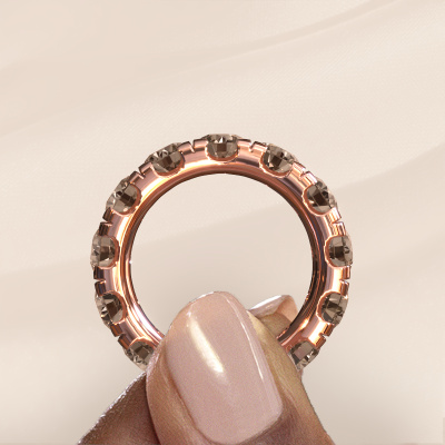 This is our Jackie 5.0 ring. This specific type is called an eternity ring and it is set with a continuous line of identically cut gemstones. The ring is made in 14 Carat rose gold and is set with small brown diamonds, 6.50 crt. The amazing brown diamonds are identical in size and are set in the ring band. Our brown diamonds are selected with great care so they are identical, which gives the best result. In order to get the best result, our artisans position all brown diamonds by hand with the utmost care. Our Goldsmiths have one ambition, which is creating the perfect ring. That is why we love what we do. In the end you get a stunning exclusive rose gold stackable ring with a row of brown diamonds which seem to have no beginning nor end. The perfect symbol of your undying love for her! How special is that!After receiving your order, our goldsmiths will passionately start the creative process of making your ring in our own studio. Because we don't have a big stockpile, these costs will not be passed on to you. Our pricing is proof of that! We offer top quality jewels at lowest price, guaranteed.Our talented designers add new designs to our online collection daily. Together they create a diverse collection of the finest jewelry. If you prefer to make a ring according your own design, please feel free to request a quote. We will make you an amazing offer, based on quality and price.To make it easier for you, we offer a 30 day return policy. Check our terms and conditions.