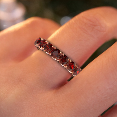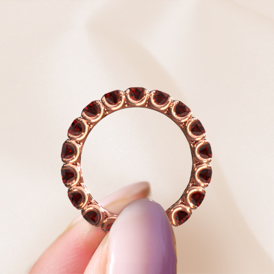 This is our Estee 3.7 ring. This specific type is called an eternity ring and it is set with a continuous line of identically cut gemstones. The ring is made in 14 Carat rose gold and is set with small garnet, 3.7 mm. The amazing garnet are identical in size and are set in the ring band. Our garnet are selected with great care so they are identical, which gives the best result. In order to get the best result, our artisans position all garnet by hand with the utmost care. Our Goldsmiths have one ambition, which is creating the perfect ring. That is why we love what we do. In the end you get a stunning classic rose gold stackable ring with a row of garnet which seem to have no beginning nor end. The perfect symbol of your undying love for her! How special is that!After receiving your order, our goldsmiths will passionately start the creative process of making your ring in our own studio. Because we don't have a big stockpile, these costs will not be passed on to you. Our pricing is proof of that! We offer top quality jewels at lowest price, guaranteed.Our talented designers add new designs to our online collection daily. Together they create a diverse collection of the finest jewelry. If you prefer to make a ring according your own design, please feel free to request a quote. We will make you an amazing offer, based on quality and price.To make it easier for you, we offer a 30 day return policy. Check our terms and conditions.